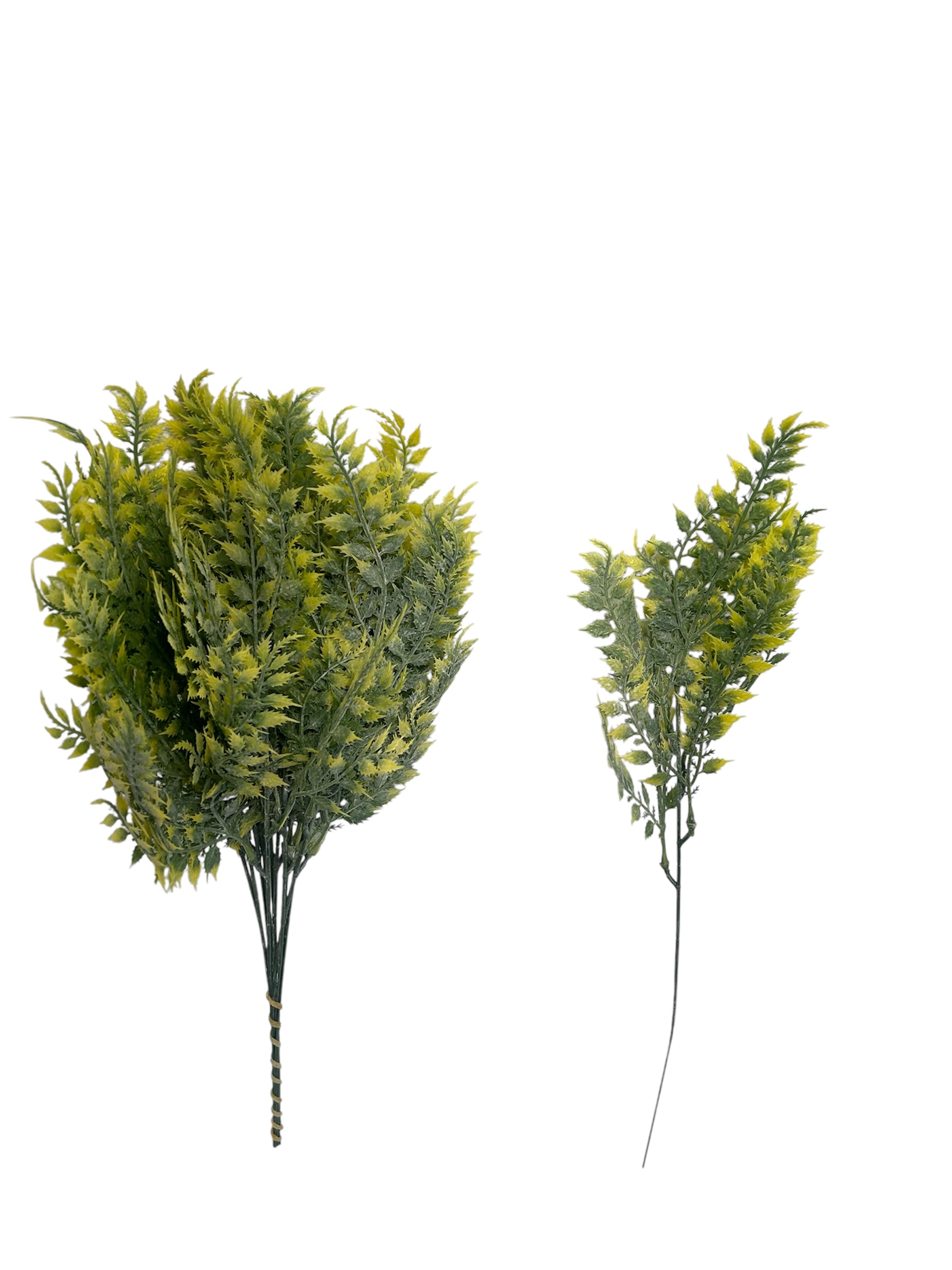 Sztuczna gałązka dekoracyjna o długości 35 cm w odcieniach zieleni z delikatnym żółtym akcentem to świetny wybór do różnego rodzaju kompozycji florystycznych. Naturalnie wyglądające, drobne listki tworzą gęstą i efektowną formę, która dodaje aranżacjom świeżości oraz lekkości.