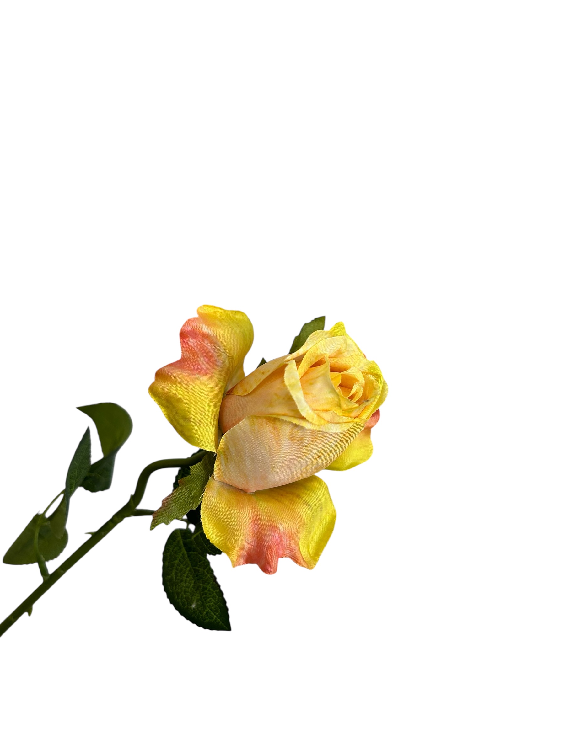 Kwiat wykonany jest z wysokiej jakości materiału, dzięki czemu wygląda bardzo naturalnie i zachowuje swój piękny wygląd przez długi czas. Róża umieszczona jest na długiej, solidnej łodydze z dekoracyjnymi liśćmi, co pozwala łatwo wykorzystać ją w różnych aranżacjach.