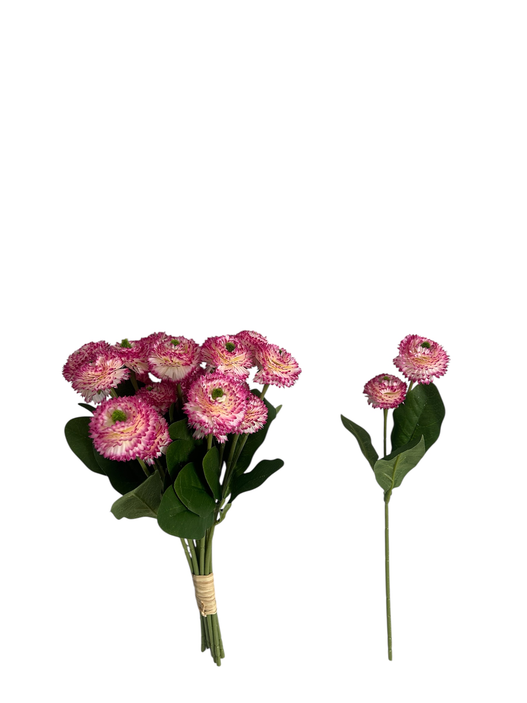 Biało-różowa  stokrotka Z2 to piękny wybór do kompozycji, które mają wyglądać romantycznie, ale jednocześnie wyraziście. Ten odcień świetnie sprawdza się w bukietach mieszanych, dekoracjach domowych oraz wiosennych stroikach. Kwiat ma drobne, gęste płatki, które nadają mu naturalnego wyglądu, a silikonowe liście podkreślają realistyczny efekt i dodają elegancji. Długość 31 cm sprawia, że stokrotka jest wygodna w pracy florystycznej – można ją skrócić, dopasować do wazonu lub wkomponować w większą dekorację. Idealna do połączenia z bielą, kremem i zielenią.